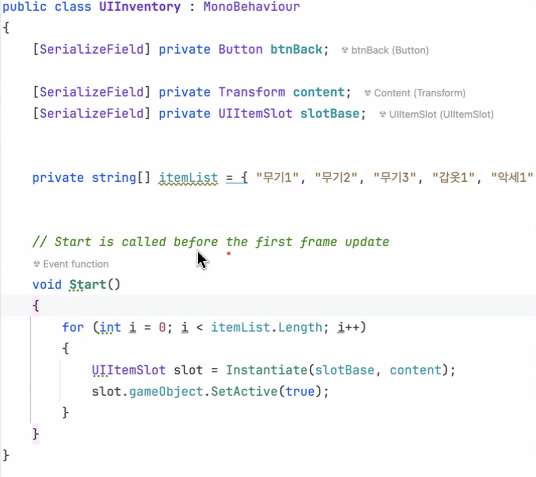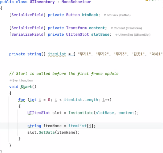 오른쪽 이미지와 같이 SetData 를 통해 슬롯을 구현한 스크립트에 정보를 전달해 줘야한다