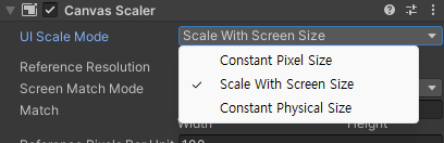 화면 비율이 달라져도 일정하게 유지하려면 Canvas의 Canvas Scaler 에서 Scaler With Screen Size 를 선택해주고,