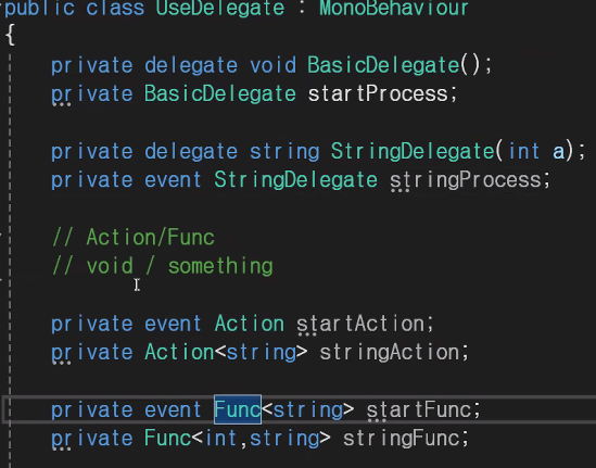 - private Func<int, string> stringFunc; → int를 매개변수로 받고 string을 반환하는 Func 선언