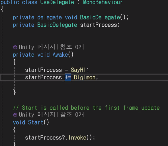 - delegate void BasicDelegate(); → BasicDelegate는 반환값이 없는 메서드를 가리키는 대리자.